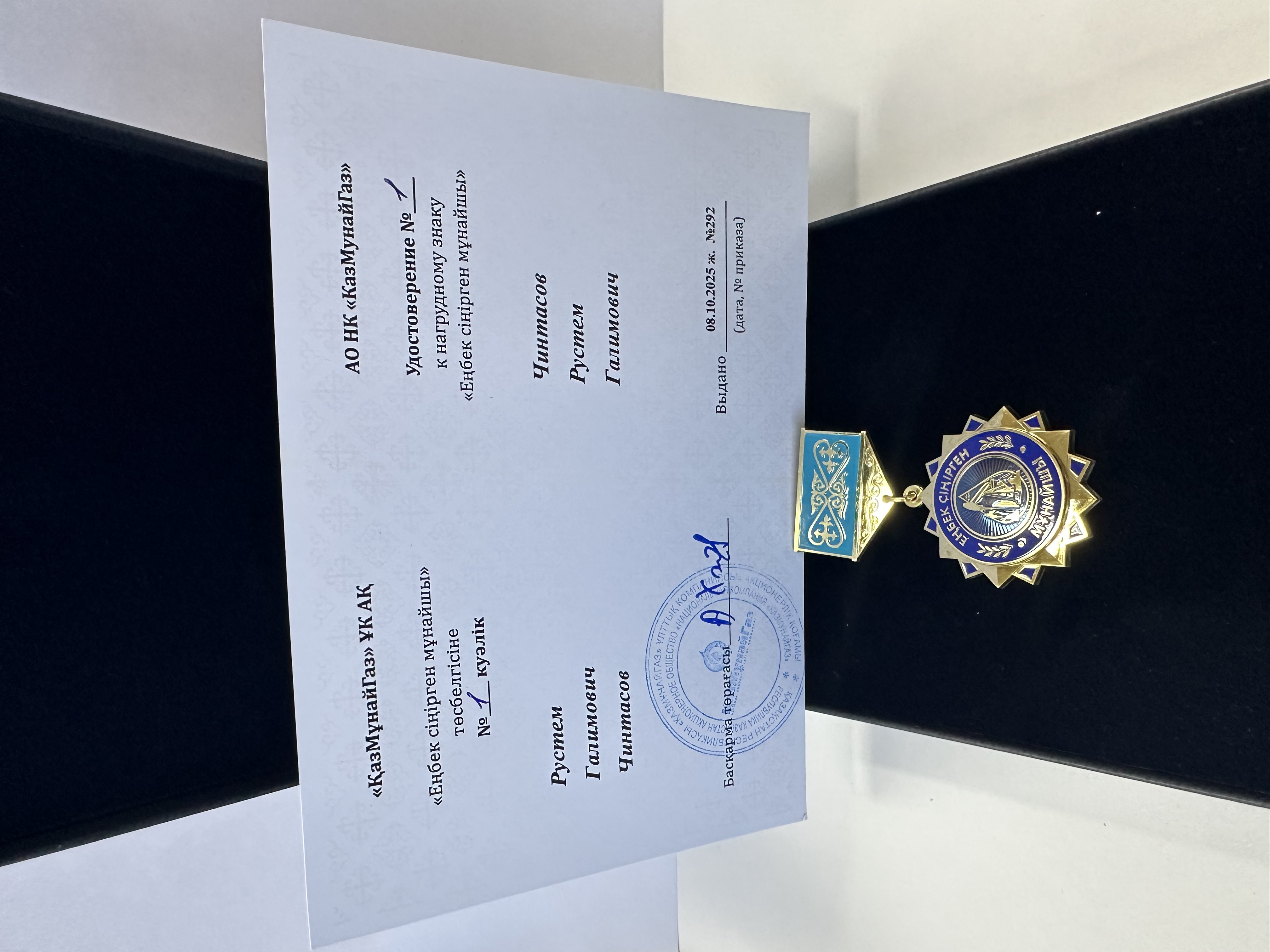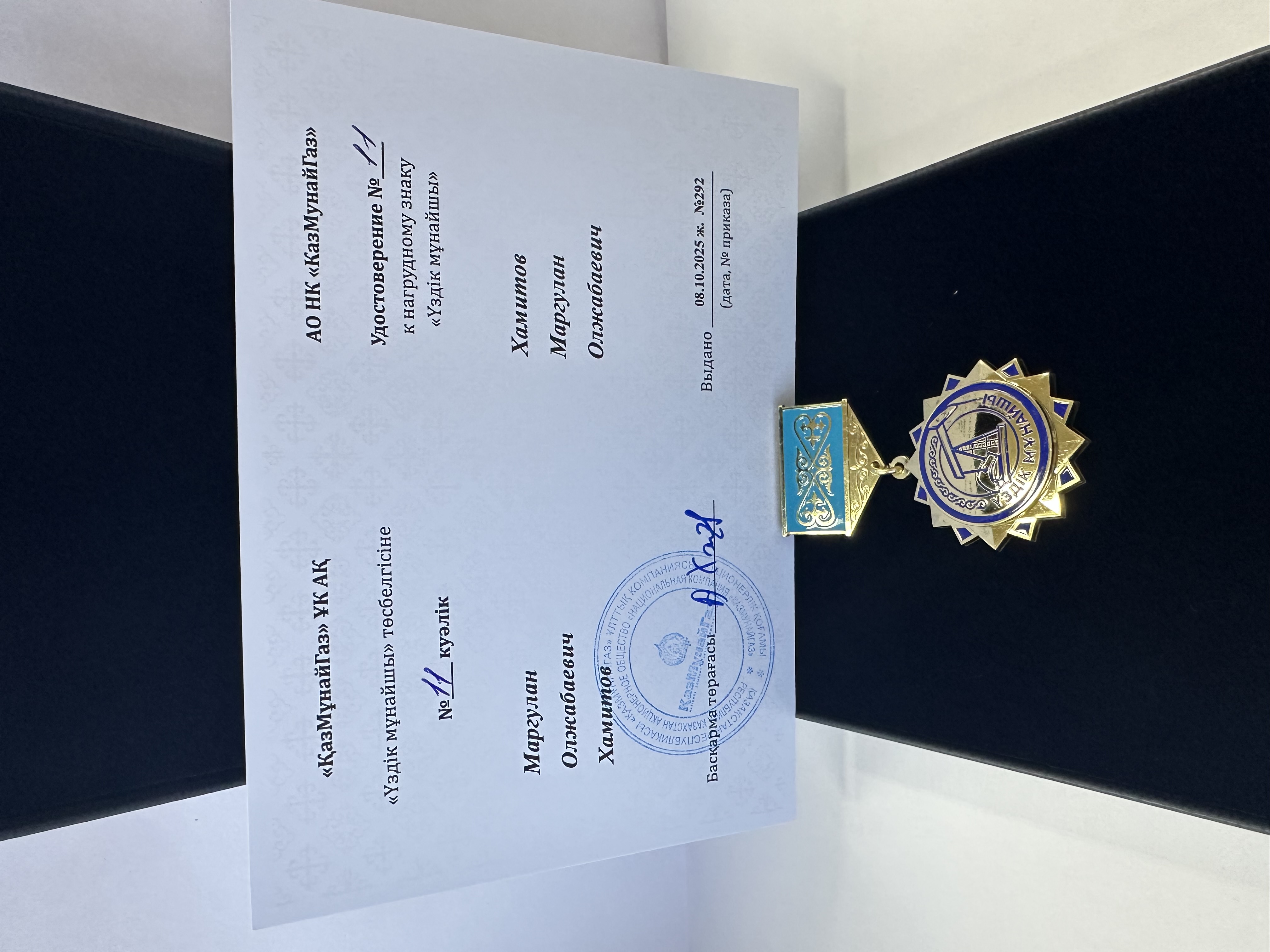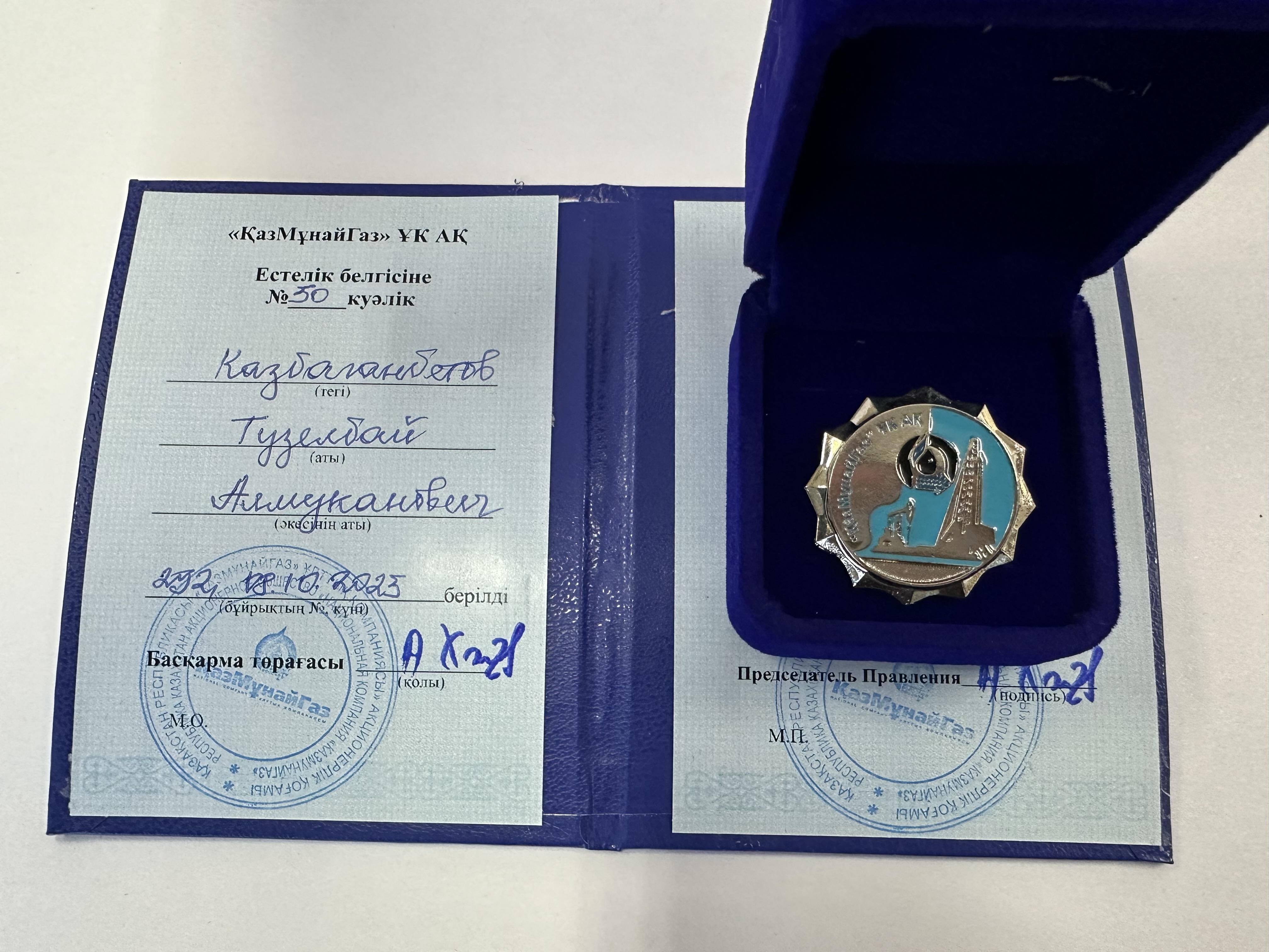 Звания «Почетный работник АО НК «КазМунайГаз» удостоен Акаев К.С., супервайзер Западно-Казахстанского филиала