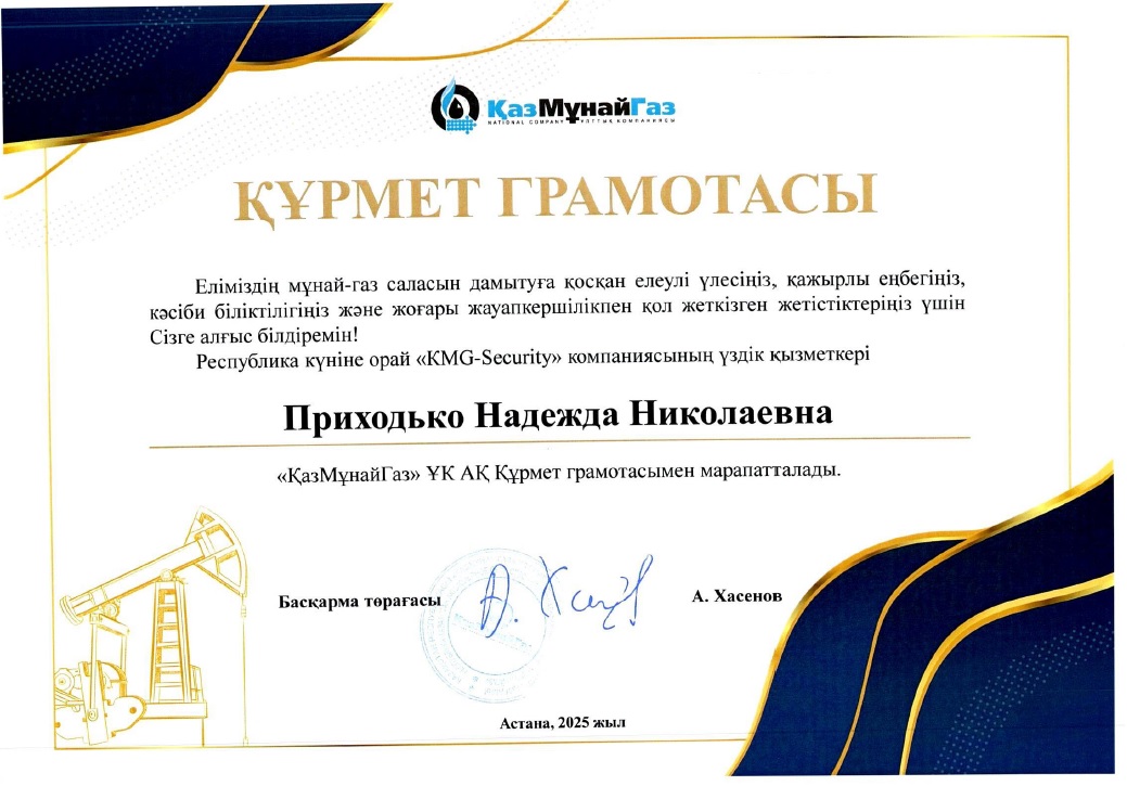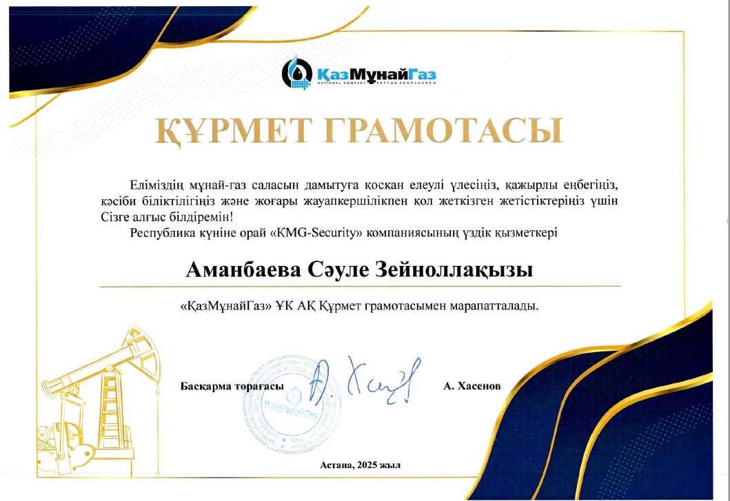 В честь Дня Республики Казахстан, за добросовестный труд, высокий профессионализм, ответственное отношение к служебным обязанностям и значительный вклад в обеспечение безопасности объектов АО НК «КазМунайГаз», были награждены следующие работники ТОО «KMG-Security»: