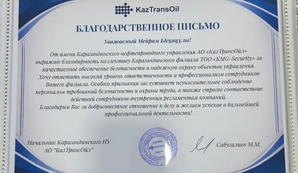 В рамках совещания начальник КНУ Сабугалиев М.М. отметил высокое качество работы Карагандинского филиала ТОО «KMG-Security». За надежное обеспечение безопасности и эффективную охрану объектов Карагандинскому филиалу Товарищества было вручено благодарственное письмо.