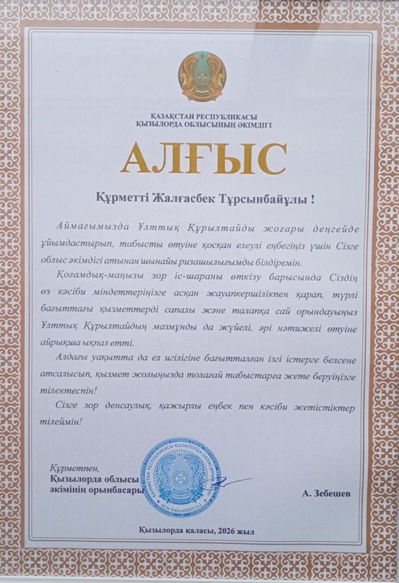 28 января 2026 года в офисе ТОО «СП «Казгермунай» состоялось совещание, в котором приняли участие генеральный директор Киякбаев З.К. и первый заместитель генерального директора Мин Хайхуей. В ходе мероприятия было отмечено активное участие работников охраны Кызылординского филиала ТОО «KMG-Security» в организации и проведении V Национального курултая в городе Кызылорде.